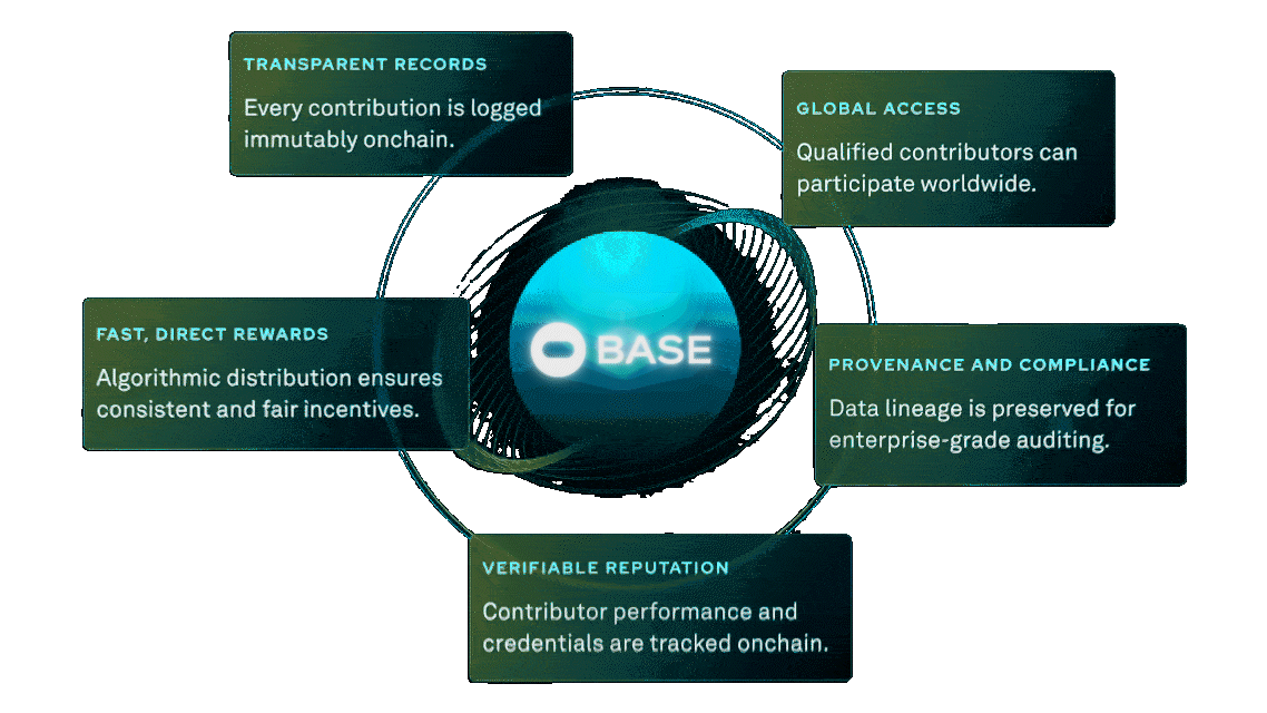 Each verified contribution is logged immutably on Base, providing clear data lineage and qualitu assurance.